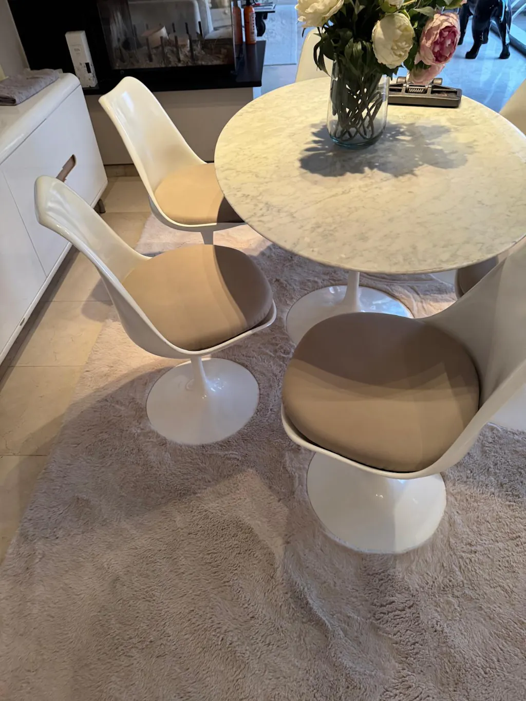 Der „Tulip Chair“ ist das erste Modell der berühmten „Sockel Series“. Die Industrie war in den 1950er Jahren nicht in der Lage, seine Idee erfolgreich umzusetzen, weshalb eine Basis für die Aluminiumfusion hergestellt werden musste. Basis aus Aluminiumguss. Glasfaserschale. Mit Klettband befestigtes Kissen, gepolstert mit Polyurethanschaum mit Stoff- oder Lederbezug.