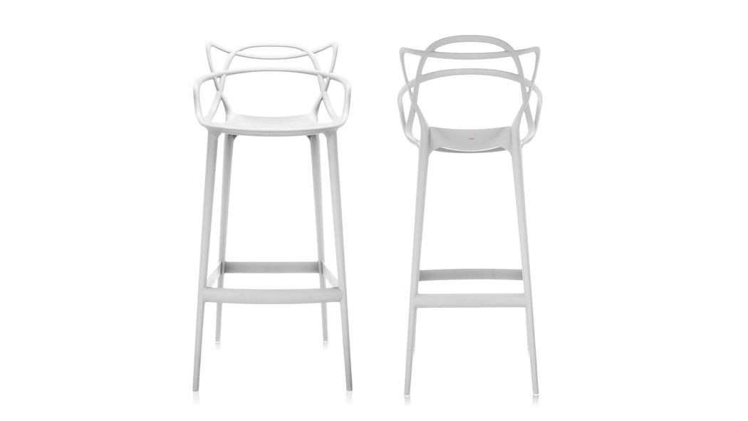 In the stool version of the Masters chair, the legs extend, the seat becomes more sober, but the distinctive graphic sign of the backrest, created by the crossing of the lines of three emblematic seats, remains unchanged. Ideal at home or in collective spaces, Masters Stool also fits perfectly outdoors.