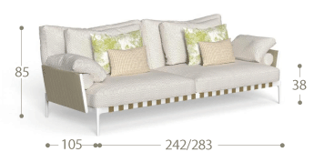 El sofá de tres plazas Salinas traslada la sofisticación típica del interior al exterior gracias a la exquisitez de sus tejidos. La refinada gama de colores evoca los tonos de la arena y el mar, dotando a los espacios exteriores de un encanto natural y atemporal. Las suaves líneas de los cojines se realzan gracias al uso de la cincha acolchada del respaldo, que se convierte en un elemento de diseño. Un complemento de decoración que ofrece continuidad entre los espacios interiores y exteriores.